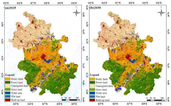 Simulation results of land use spatial layout in (a) 2025 and (b) 2030 using the FLUS model.
