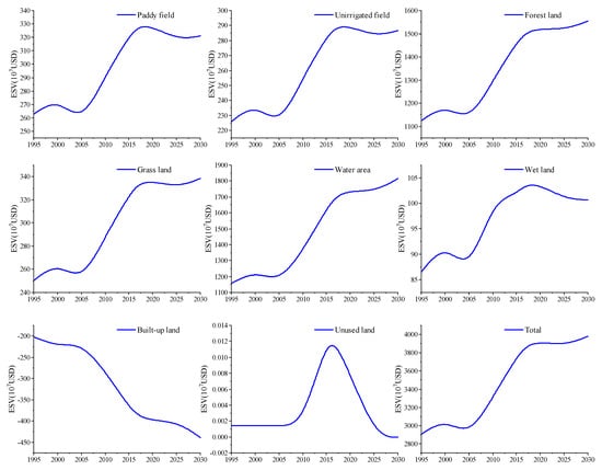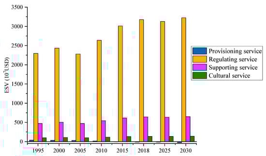 Changes in ESVs of different ecosystem service types from 1995 to 2030.