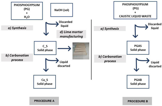 The main aim of this work is the characterization and control of the phases resulting from PG waste transformation by two processes: Procedure A is based on treatment with Na(OH) in which the controls were performed on the portlandite obtained as lime paste in the first phase and also in the calcite resulting from carbonation. Additionally, lime mortars were manufactured from lime paste and standardized siliceous sand to verify the behaviour once the resulting material was stabilized [30], as well as its possible viability as construction material. Procedure B is based on the reaction with the residual liquid of the aluminium industry. It was carried out on the katoite from the first reaction and the final calcite obtained after the carbonation process.
