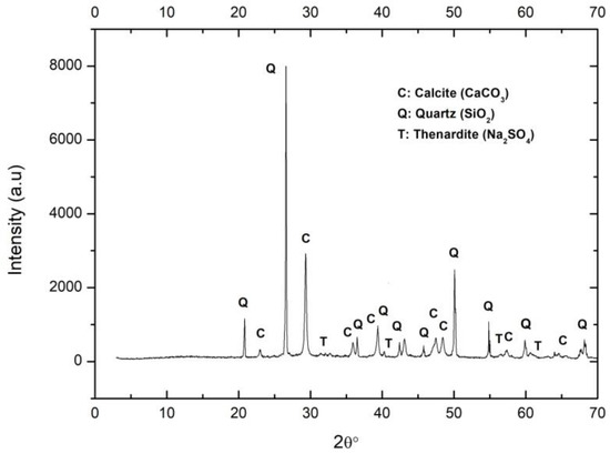 As expected, the majority in the discarded sand was calcite. The portlandite was fully carbonated. Small reflections of residual thenardite in the lime were also observed (Figure 3).