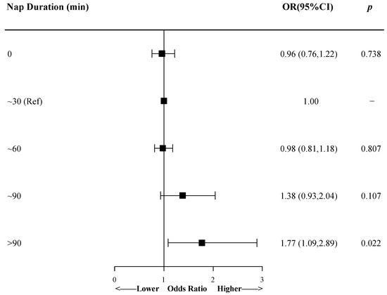 Association between nap duration and metabolic syndrome has been reported in several previous studies. Lin et al. conducted a cross-sectional study of 8547 subjects with a mean age of 56 years and reported that a nap of more than 60 min was associated with a higher prevalence of metabolic syndrome only in females [22]. The cross-sectional evidence from the Dongfeng-Tongji retiree cohort study suggested that longer daytime napping (≥90 min) was associated with metabolic syndrome in females [23,24]. Recently, a study of 1679 older adults by van der Pal et al. found a relationship different from the previous studies. They linked both daytime naps of ≤30 min and >30 min to metabolic syndrome, compared with those who did not nap [25]. In addition, a meta-analysis in 2016 showed that longer nap duration (≥60 min) was associated with a higher risk of metabolic syndrome and revealed a J-curve relation; however, the analysis included only two articles and pooled odds ratios (ORs) from different nap duration group (>60 and ≥90 min) into one [26]. The contradictory results can be attributed to differences in the populations, ages, and classifications of nap duration in these studies. The risk of prolonged napping may vary across occupations and age groups, and we cannot ascertain the risk of 61~90 min nap group if the >60 min group was not split. More detailed evidence from wider populations and age groups is needed to resolve these contradictions.