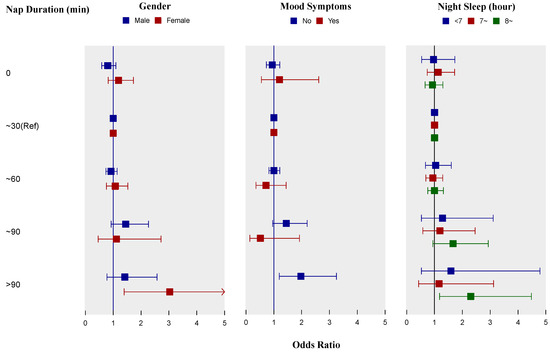 The association between nap duration and prevalence of metabolic syndrome by logistic regression model. Model was adjusted for demographic factors, lifestyle habits, mood symptoms, and sleep-related characteristics. Small squares represent the point estimates of odds ratios, and horizontal lines represent 95% CIs. OR, odds ratio; CI, confidence interval; Ref, reference.