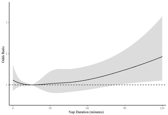 Figure 3 displays multivariate adjusted restricted cubic spline curve of all participants—the OR initially decreased and reached its lowest at a nap of about 15 min, and then it increased slightly until about 45 min, followed by a relatively rapid increase at longer nap duration. Females had a similar trough around 15 min, while ORs for all nap durations were not significant among males (Supplementary Figure S2).