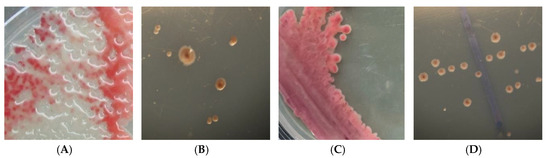 R. solanacearum NAIMCC-B-01630 was tagged with gfp by triparental mating with Escherichia coli S17-1 containing Tn5 gusA gfp cassette and E. coli HB101 containing pRK2013 [23]. Briefly, transconjugants were selected on Luria Bertani (LB) agar plates containing nalidixic acid and kanamycin. The positive transconjugants were selected by visualizing under UV for fluorescence. The presence of gfp in the selected transconjugants was also confirmed by amplifying 650 bp of the amplicon, using YL065 (F) 5′-GCGATGTTAATGGGCAAAAA-3′ and YL066 (R) 5′-TCCATGCCATGTGTAATCCT-3′ as primers. The selected GFP-expressing transconjugants of R. solanacearum NAIMCC-B-01630 strains were used to carry out further experiments after confirming that the gfp tagging did not affect the pathogenicity of the bacterium. The positive transformants were compared with the wild-type strain to see if there was any change due to gfp on colony morphology, growth characteristics, and virulence. The transformants exhibiting behavior similar to the wild type were selected and used in further experiments. The colony morphology of R. solanacearum NAIMCC-B-01630 used for tagging was fluidal, as shown in Figure 2.
