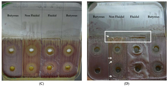 Protocol for induction of virulence colony types in R. solanacearum, using full-strength KMTTC medium. (A) Induction of the fluidal colony by Indian gooseberry extract. (B) Slanting for induced nutrient deprivation in R. solanacearum. (C) Swabbing of R. solanacearum culture differ in colony type in slanting KMTTC agar medium. (D) Induction of fluidal colony after three days; white rectangle indicates the effect of nutrient deprivation (slanting edge), whereas white arrows indicate the effect of Indian gooseberry fruit extract; left-to-right sequence = NAIMCC-B-01630 (butyrous), NAIMCC-B-01630 (non-fluidal), NAIMCC-B-01630 (fluidal), and TB-01838 (butyrous).