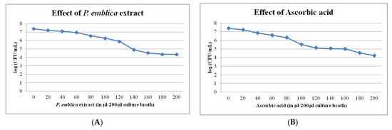 Effect of different concentrations of P. emblica extract (A) and ascorbic acid (B) on the viability of R. solanacearum NAIMCC-B-01630 cells in log (CFU/mL).