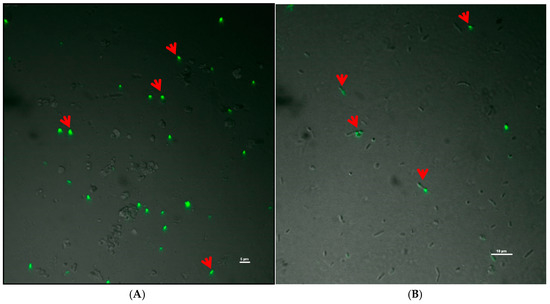 Live–dead cell imaging using SYTO-9 and propidium iodide under confocal scanning laser microscope; arrow indicating live cell signals, (A) cells from extract diffusing zone (induced zone), and (B) cells from region away from the diffusion zone.