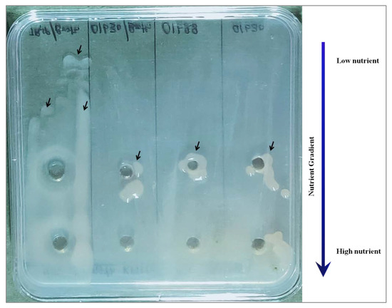 To further confirm, the live–dead cell imaging was performed by taking the biomass from the diffusion and non-diffusion zone. It was found that some of the bacteria were still alive in the diffusion zone, as indicated in red arrows in Figure 5. SYTO-9-stained yellow fluorescing cells could be spotted in the suppression zone, indicating live cells. The BacLight staining proved that the P. emblica extract did not kill the R. solanacearum population completely around the suppression zone. The live cells present here started growing once the extract started diffusing out. Once the cells survived the challenge of nutrient deprivation/P. emblica extract, they may be getting some induction for forming virulent colony type. In the suppression zone, resurgence could also be due to the availability of free space and nutrients. It is also reported that virulence genes of R. solanacearum get activated [28] due to the environmental pressure.