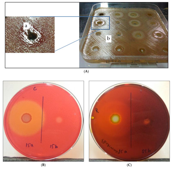 Effect of this protocol on induction of two other virulence factors (production of cellulase and pectinase). (A) Induction in appearance of fluidal colonies, (B) difference in cellulase production capabilities between induced and non-induced colonies (between zone ‘a’ and ‘b’), and (C) difference in pectinase production capabilities between induced and non-induced colonies.