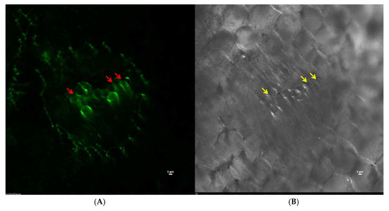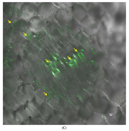 Confocal scanning laser microscope images showing colonization of gfp-tagged R. solanacearum NAIMCC-B-01630 in tomato root; red arrows indicate vascular colonization of the tagged pathogen in 488 channel, and yellow arrows indicate the same in the TD channel (A) vascular colonization as seen in the 488 nm channel, (B) vascular colonization as seen in TD channel, and (C) superimposed image of 488 and TD channels.