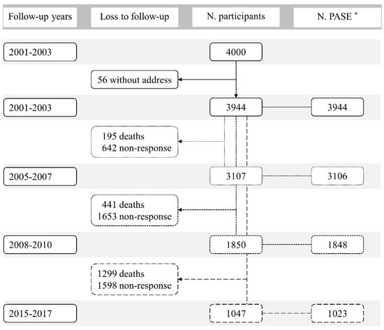 Flowchart of the study participants over the study period. * Number of participants who completed the Physical Activity Scale for the Elderly (PASE).