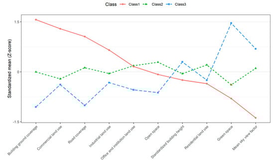 Standardized mean (Z-score) for each built environment characteristic by latent class.