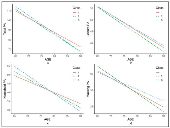 ANOVA (for continuous variables) or chi-squared test (for categorical variables) was used to determine whether there were significant differences in the baseline characteristics of the study participants between the three BE classes. To take into account repeated measurements for each participant, weighted linear mixed-effects models were used to explore the associations between the BE class and change in the level of PA, using age (centered at mean age at baseline, 72.5 years, and divided by 5 to give change over 5 years) as a timescale. The fixed effect included BE class, age, and their interaction term. As random effects, we used intercepts for participants (random intercept), as well as by-participants slopes for the effect of change in PA (random slope). The estimated effect of the interaction term between the BE class and age reflected the impact of the BE class on annual change in PA (longitudinal association). The main effect of BE class reflected the baseline difference in PA that were associated with the BE class (cross-sectional association). Since previous studies suggested that certain covariates might affect the associations of BE with PA [,,,,,,], such as diluting the associations, three models were constructed to control potential confounders: Model 1—adjusted for sex; Model 2—adjusted for sex, marital status, education level, alcohol drinking, smoking, years lived in Hong Kong, living alone, self-rated health, depression, MMSE, CSI-D and number of chronic diseases; covariates in Model 2 were treated as time-varying variables, except sex, education level, years lived in Hong Kong and CSI-D; Model 3—adjusted for all covariates in Model 2 plus baseline PA level (total, leisure, household and walking PA, respectively) to minimize the possibility of reverse causality.