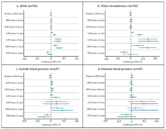 Associations of activity patterns with cardiometabolic risk factors. Coefficient (95% CI): regression coefficients and 95% confidence intervals. Coefficients and 95% Cis were standardized across figures to aid comparison between variables. ● Model 1 (adjusted for wear-time and trial involvement, and accounted for clustering within schools). ▲ Model 4 (further adjusted for the total daily volume of the corresponding intensity, participants’ age, sex, and socioeconomic status). Results from the partially adjusted Model 2 (included adjustment for the total daily volume of the corresponding intensity in addition to minimally adjusted Model 1) and 3 (additionally adjusted for age and sex in addition to partially adjusted Model 2) can be found in Tables S5 and S6. Breaks in SED (number per day) were defined as an interruption in SED where counts exceeded 25 counts per 15 s epoch [4,17] and averaged over all valid days. Bouts were calculated as the daily time accumulated in either ≥1, ≥5, or ≥10 min bouts of the corresponding intensities (in minutes) and averaged over included days. SED: sedentary; LPA: light-intensity physical activity; MPA: moderate-intensity physical activity; VPA: vigorous-intensity physical activity; zBMI: body mass index converted to the World Health Organization (WHO) Child Growth Standards age- and sex-standardized z-values [20]; min: minutes. Figure 1a. zBMI (n = 782); Figure 1b. Waist circumference (n = 782); Figure 1c. Systolic blood pressure (n = 637); Figure 1d. Diastolic blood pressure (n = 637); Figure 1e. High-density lipoprotein cholesterol (n = 525); Figure 1f. Low-density lipoprotein cholesterol (n = 525); Figure 1g. Triglycerides (n = 525); Figure 1h. Cardiometabolic risk score (n = 404).