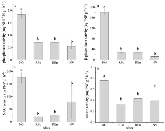 | N (g kg−1) | 3.38 ± 0.21 a | 1.47 ± 0.12 b | 1.10 ± 0.06 b,c | 0.99 ± 0.14 c |