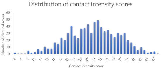Each category was assigned a score: 1 for less intense interactions (number of interactions (n = 5), 2 for intense interactions (n = 13), and 3 for highly intense interactions (n = 7) (Table 1). These scores were assigned to the respondents as follows: when a respondent indicated that an interaction occurred sometimes or often, the total score assigned to that interaction was given to the respondent. If an interaction never occurred, the respondent got a score of zero for that interaction. Hygiene measures taken by a respondent were assigned a negative score (−1, n = 2). By summing up the different scores per respondent, an individual contact intensity score (maximum of 52 points) was obtained. As a result, implementing the asked hygiene measures lowered the contact intensity score, while more intense contact resulted in a higher score.