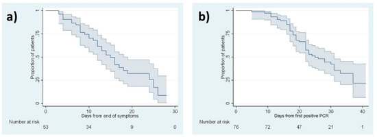 | First positive PCR to Negative PCR | 76 | 44 | 32 | 25 (18, 37) | 19 (16, -) | 30 (22, 37) | 0.076 | 22 (17, 37) | 31 (23, -) | 0.119 |