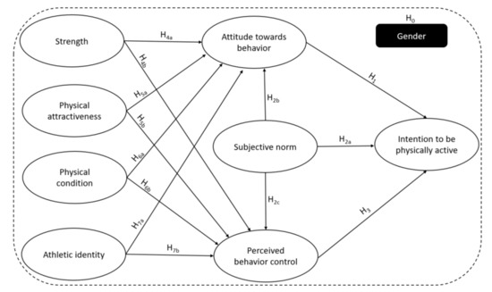 However, in the literature of social psychology, the process by which identity influences intention and behavior is still understood. Most studies have demonstrated small to large effects of identity on intention [44,66],. and identity is strongly correlated with attitudes [62,66], and perceived behavioral control [44,65]. Moreover, some researchers have found self-identity to be the second most reliable predictor of the intention to be physically active [32,43,67]. However, few other studies have examined the role of self-identity in the antecedents of TPB in human behavioral intentions [68]. Besides, physical self-concept [49] and athletic identity [43], are also known to dictate people’s physical activity awareness, no studies have included both of them within the TPB framework to analyze the moderating effect of gender. Hence, this study aims to analyse if there are significant differences in the variables related to the intention to be physically active after graduation according the adolescents’ gender. Moreover, it aims to analyze if the adolescents´ gender has a moderating effect on the antecedents of the intention to be physically active after graduation by using the TPB framework, and integrating the physical self-concept dimensions and athletic identity variables. For this purpose, the following hypotheses are enunciated which can be seen summarized in Figure 1.