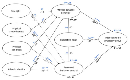 First, the model for male adolescents presents a good fit index, as the SRMR (.06) was lower than 0.08 [80]. Also, both the values of d_ULS with 1.60 (HI95 = 2.04) and d_G with 0.93 (HI95 = 1.19), were found within the confidence interval, being thus not statistically significant values (p > 0.05), as recommended by the literature [81]. About the predictor variables, the variables physical attractiveness (β = 0.36; p < 0.001), physical condition (β = −0.24; p < 0.05), and athletic identity (β = 0.56; p < 0.001), exerted a direct influence on the control of perceived behavior. Physical attractiveness and athletic identity did it positively, while physical condition did it in a negatively, explaining 42% (R2 = 42) of the variance of this variable. Therefore, H5b and H7b hypotheses were accepted. However, the H2c, H4b, and H6b hypotheses were reputed. These results may be because the condition did exert a direct influence in a statistically significant way, but negatively, and the other two variables did not turn out to have a statistically significant influence. Also, athletic identity directly and positively influenced attitude towards behavior (β = 0.37; p < 0.001), explaining 20% (R2 = 0.20) of the variance. Therefore, only the H7a hypothesis was verified. However, the hypotheses H2b, H4a, H5a, and H6a are refuted. These hypotheses are refuted because none of the other variables proved to influence in a statistically significant way. Finally, there are also statistically significant relationships between the attitude towards behavior (β = 0.21; p < 0.001), the perceived behavioral control (β = 0.28; p < 0.001), and the subjective norm (β = 0.36; p < 0.001), with the intention to be physically active. The relationships between these variables are directly and positively. Therefore, the hypotheses H1, H2a, and H3 were accepted. Thus, the model was able to explain 38% (R2 = 0.38) of the intention to be physically active after graduating.