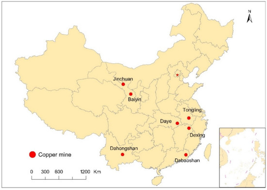 The study covers seven copper mines located in six provinces in China. Seven heavy metals (Cd, Cu, Zn, Hg, Pb, Cr and Ni) content data in river water sediments were collected from the literature in 2005–2013 from three major online literature databases (Web of Science, Science Direct and China National Knowledge Infrastructure). The criteria for collecting the scientific literatures were: (1) China’s top 20 copper mines, (2) the literature, and (3) the highest possible regional distribution. Therefore, the selected copper mines are the Tongling [25], Dabaoshan [26,27], Dahongshan [28], Daye [29], Jinchuan [30], Baiyin [30], and Dexing copper mines [31]. Figure 1 shows the specific distribution location of each copper mine.
