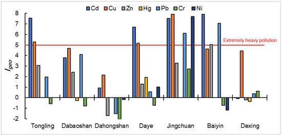 Geoaccumulation index of sediments in rivers surrounding typical copper mines.