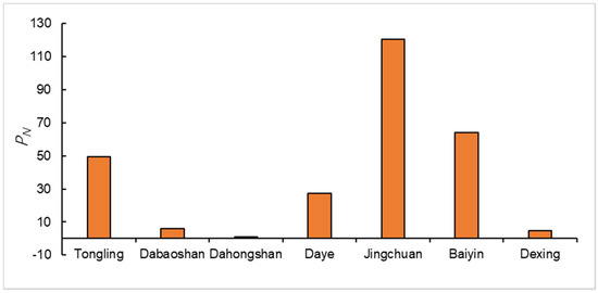 According to the evaluation of the heavy metal pollution degree of the sediments in the surrounding rivers of seven mining areas by the potential ecological risk index, it can be seen from Table 4 that the ecological risk of a single heavy metal in the sediments is in the order of Cd > Cu > Pb > Ni > Hg > Zn > Cr from large to small. It can be seen that Cd is the main source of potential ecological risks in the sediments surrounding the copper mine, and Cd has far more influence on the water ecology around copper mines than other metals. The potential ecological risk index of each copper mine was Jinchuan, Baiyin, Tongling, Daye, Dabaoshan, Dexing and Dahongshan in the order of large to small. Among them, Jinchuan, Baiyin, Tongling, Daye and Dabaoshan all achieved extremely high ecological risks, while Dahongshan had relatively low ecological risks. It can be seen that ecological risks have been prevalent in the rivers around the copper mines.