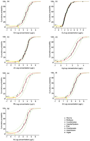 Species sensitivity distribution curves of seven heavy metals to all species. (a)-SSD curve for Cd; (b)-SSD curve for Cu; (c)-SSD curve for Zn; (d)-SSD curve for Hg; (e)-SSD curve for Pb; (f)-SSD curve for Cr; (g)-SSD curve for Ni.