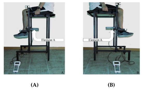 Figure 1) that can be placed at five different vertical heights (from seat height down to about 70 cm below that, for different lower limbs lengths), different antero-posterior positions (continuous regulation from the seat’s forward edge with a vertical projection up to 13 cm forward, for different knee angles), and the ability to point backwards (for flexion) or forwards (for extension). Element A was differently placed vertically and horizontally according to each participant’s shank length. A load cell (750 kg, 1000 Hz; H3-C3/C4-750kg-3B, Zemic Europe, Etten Leur, Netherland) is connected (i.e., embedded in) to Element A, which in turn connects the load cell to a metal plate perfectly in contact with the tested lower limb skin (pressure point). Namely, the load cell measures the horizontal (or “tangential”) knee flexion or extension isometric force applied against it. The structure is completed by a support plate for the foot, where the foot was softly placed on without weighing significantly on it. The foot support plate can be placed at any of a number of different vertical heights (from seat height down to about 80 cm below that, for different lower limb lengths). The pressure point is chosen on the shank skin, at two thirds distance from knee, and just above the ankle. By adjusting the ISOM settings differently, it is possible to assess ankle or elbow flexion or extension isometric force. Due to the novelty of the ISOM, it took an appropriate time to study its manual and practice enough with the ISOM before starting the testing of participants. Author LR adjusted the settings (set-up time about 5 min), RD took measures (including anthropometric ones), and JP supervised all operations. Mechanical ISOM signals were recorded and digitalized by a portable device (5 kN full scale; 1 N reading graduation; 24-bit resolution; FC5k, Axis, Gdańsk, Poland).