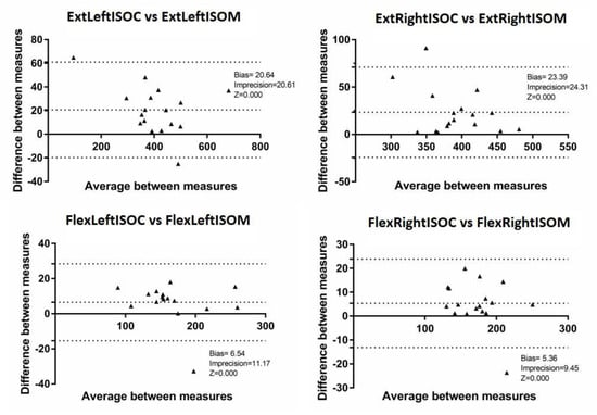 Table 1 including ISOC-ISOM difference 95% limits of agreement). The ISOC’s left and right knee extension peak isometric forces resulted (average ± standard deviation) in 415.40 ± 115.15 N and 402.81 ± 41.73 N respectively, compared to the corresponding ISOM’s values of 394.73 ± 123.28 N and 379.46 ± 50.78 N (+20.64 N/+5.1% and +23.39 N + 5.9%). The ISOC’s left and right knee flexion peak isometric forces resulted in 169.95 ± 44.09 N and 175.65 ± 31.60 N, respectively, compared to the corresponding ISOM’s values of 163.41 ± 46.72 and 170.29 ± 34.29 N (+6.54 N/+3.9% and +5.36 N/+3.1%). Therefore, only a small (i.e., 3–6%;