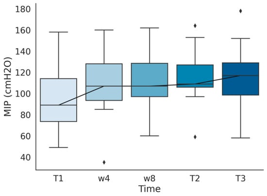 Maximum Static Inspiratory Pressure (MIP) measured before training (T1), after the first (w4) and second (w8) month of training, at the end of the program (T2), and in a six months follow-up after finishing the program (T3).