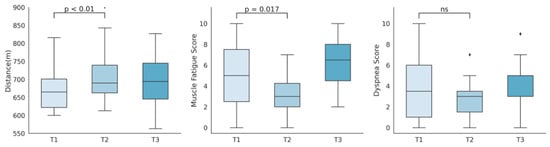 Representation of six-minute walking test distance travelled, muscle fatigue score, and dyspnea score, measured before (T1), immediately after (T2), and six months after the program (T3).