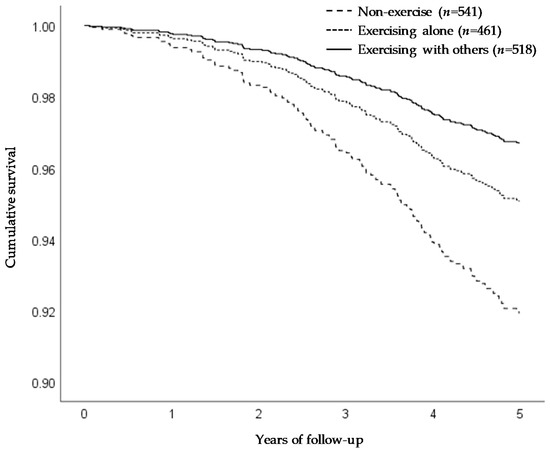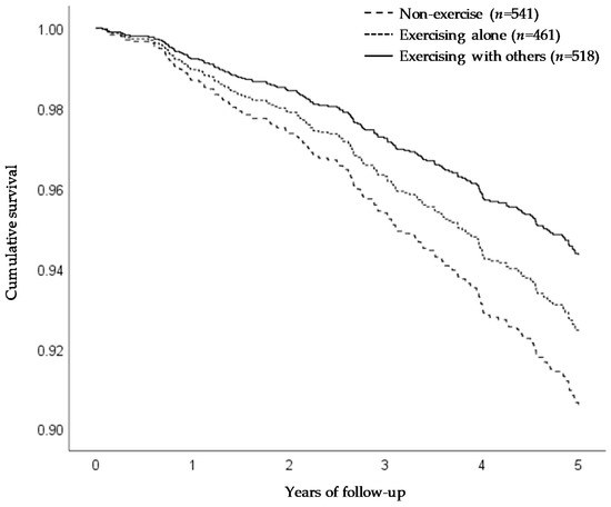 In this study, we were able to confirm a favorable relationship between exercise habits and mortality. Compared with those who did not exercise, older adults who either exercised alone or exercised with others had a lower mortality rate for five years, despite the adjustment of the analysis for potential confounders. Conversely, we did not observe a statistically significant difference between exercising alone and exercising with others in models 1 and 2. This may be attributable to the low statistical power of our sample to detect a difference in mortality between the two groups because the HRs tended to be relatively low and we could see the significant difference in the unadjusted model and the p value was <0.1 in model 1. Thus, a more robust sampling, longer follow-up period, and/or a larger sample size may allow detection of such associations.