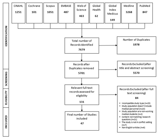Chicago/Turabian StyleHabib, Rima R., Dana A. Halwani, Diana Mikati, and Layal Hneiny. 2020. "Sex and Gender in Research on Healthcare Workers in Conflict Settings: A Scoping Review" International Journal of Environmental Research and Public Health 17, no. 12: 4331. https://doi.org/10.3390/ijerph17124331