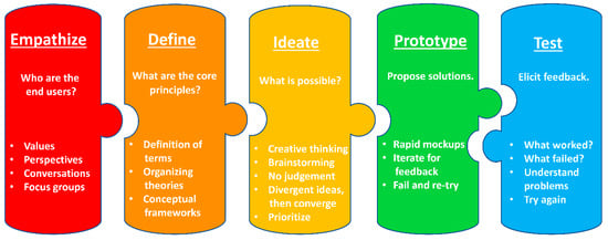 Design thinking is an iterative process consisting of five stages: (1) Empathize, (2) Define, (3) Ideate, (4) Prototype, and (5) Test []. The last two steps may be repeated many times until the optimal design has been achieved. During the Empathize stage, teams consider who the end user of the solution will be and what their core values and perspectives are to ensure the solution will be appropriate to their requirements. During the Define stage, teams consider the goals, skills available, and core principles that frame the work ahead. During the Ideate stage, teams value creative thinking and brainstorming as they generate the widest variety of possible solutions. With this foundational work accomplished, the Prototype and Test cycle begins, as teams undertake a process of creating possible solutions and then eliciting feedback on these potential solutions to shape and re-shape them until an optimal conclusion has been achieved [].