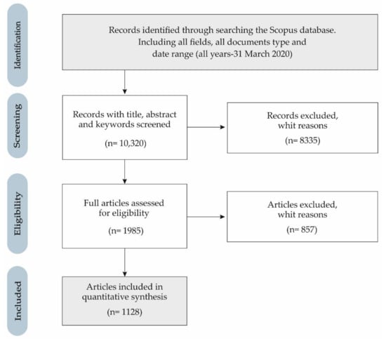 The process followed in the selection of the sample conforms to the flow chart of Figure 1, according to the Preferred Reporting Items for Systematic Reviews and Meta-Analyses (PRISMA) guidelines [90]. Thereby, in phase 1 (identification) 10,320 records were identified from the Scopus database, considering all the fields for each of the search terms (cyberbullying, cyber-bullying, social, economic, education), all types of documents and all the data in the data range (all years—31 March 2020). In the next phase 2 (screening) the option of “article title, abstract and keywords” is chosen in the field of each term, so that 8335 records are excluded. Subsequently, in phase 3 (eligibility), with 1985 records, the data range is chosen from all years to the last full year (2019), and the document type only selects the articles, for quality assurance that they have derived from the peer review process. Hence, this phase excluded 857 records. For these reasons, in the last phase (included), the final sample is collected with 1128 articles. Essentially, the search selected records from the subfields title, abstract and keywords, in the period that contains the publication of the first article on the research topic (2004) until the last full year (2019), that is, a period of 16 years has been analysed, in the same way that it has been applied successfully in various works that have used bibliometric methodology [91,92,93]. The representation of this sample of articles is supported by the proven quality of the Scopus database, regarding the indexing protocol, in addition to the systematic procedures of the search criteria.