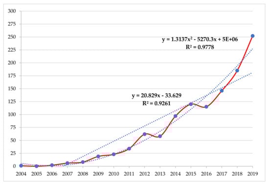 Furthermore, this result is confirmed if it is observed that in the last five years (2015–2019) 818 articles have been published, which represent 72.52% of the total; while in the last decade (2010–2019) 96.81% (1092) of total contributions were published. On the other hand, in the first year analysed (2004), only one article was published; while in the last year studied (2019), 252 articles (22.83%) were published.