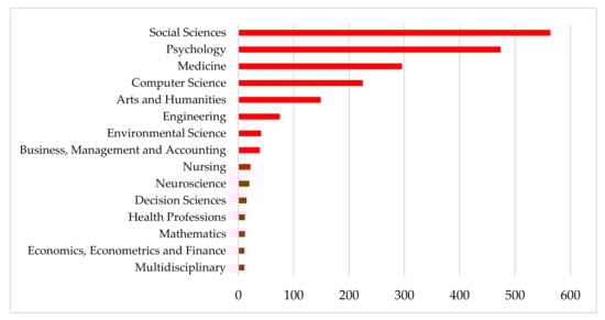 Figure 3 presents the classification by subject areas of the articles in the global research on CB, during the period 2004–2019. Social Sciences is the category that collects the most articles with 28.51% of the articles published (564) in the total sample. Next, it follows the Psychology (23.71%, 474), Medicine (14.81%, 296), Computer Science (11.26%, 225), Arts and Humanities (7.45%, 149), Engineering (3.75%, 75) and Environmental Science (2.05%, 41). The five most relevant thematic areas group 85.44% of the articles published in the period 2004–2019. The rest of the thematic areas do not reach 2% of published works.