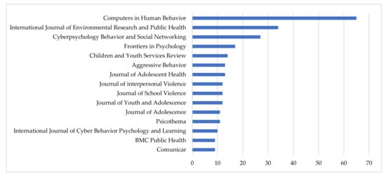 Figure 4 presents the fifteen most productive scientific journals on this research topic. Taking into account the number of articles published and the percentage they represent of the total sample, this ranking is led by Computers in Human Behavior (65, 5.76%) and International Journal of Environmental Research and Public Health (34, 3.01%). They follow them, in order, Cyberpsychology Behavior and Social Networking (27, 2.39%), Frontiers in Psychology (17, 1.51%), Children and Youth Services Review (14, 1.24%), Aggressive Behavior (13, 1.15%), Journal of Adolescent Health (13, 1.15%), Journal of Interpersonal Violence (12, 1.06%), Journal of School Violence (12, 1.06%) and Journal of Youth and Adolescence (12, 1.06%). The rest of the journals in this Figure 4 do not reach 1% of the total contributions.
