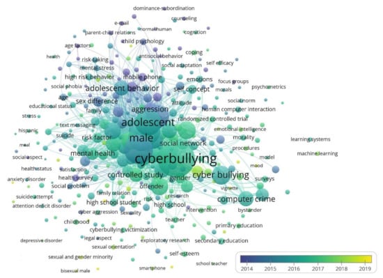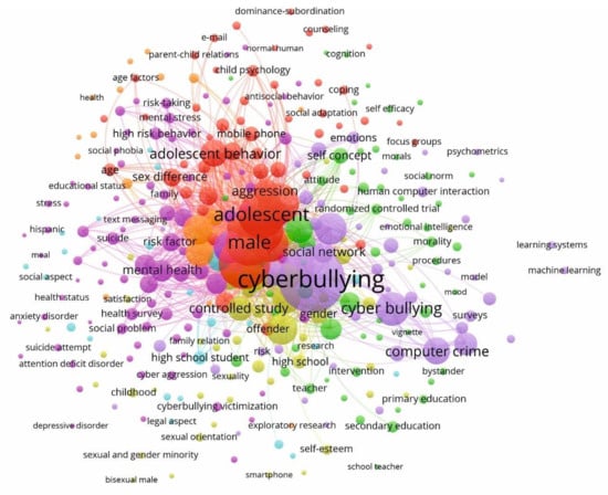 The top twenty keywords associated with the total sample of 1128 articles on the global research of socioeconomic factors linked to CB in the educational context, according to the Scopus database, are “adolescent”, “Internet”, “child”, “psychology”, “social media”, “major clinical study”, “crime victim”, “computer crime”, “victim”, “adolescent behavior”, “adolescence”, “aggression”, “social networking (online)”, “school”, “education”, “mental health”, “depression”, “victimization”, “peer group” and “sex difference”.