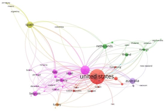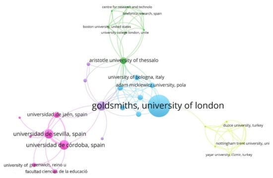 Likewise, the co-occurrence analysis is used in order to provide a graphic visualization of the connection of the key terms of the analysed documents. The co-occurrence networks provide a graphic map of the relationships between the authors, institutions, countries, or keywords of a sample article on a given research topic. In this sense, the proximity relationship of two or more keywords is established in a text unit. Thus, if the keywords coexist in a sentence, that is, they appear together, there is a probability of semantic relationship [100].