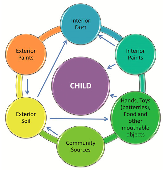 Children are exposed to environmental lead via inhalation and ingestion. Inhalation contributes to higher blood levels in children than in adults. Dirt, dust and food are the largest sources of Pb in children, while ingestion from water is generally a less significant source (Figure 3). The exposure of young children to lead is substantially enhanced by the common infant and toddler behavior of tasting objects, putting hands into the mouth immediately after playing, etc. [2,10]. When young children live in environments with Pb contamination, the ingestion of potentially toxic elements is likely. Increased risk of lead poisoning occurs in families where one parent works in an environment with high levels of lead. Parents who are exposed to Pb in the workplace often bring lead dust into the home on their clothes or skin, thereby increasing the risk of exposure for their children to workplace lead. The monitoring of Pb concentrations in children’s blood is recommended (atsdr.cdc.gov) because of their vulnerability [2,5,6,9].