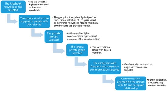 A Facebook group titled “Alzheimer’s and Dementia Support” was selected for in-depth analysis as the largest private discussion forum with 30,911 members (valid to 17 January 2020). This group is aimed at peer-to-peer support to caregivers of persons with AD, and the membership is restricted to people who know a person affected by a neurodegenerative disease. The group consists of people living mainly in the United States, United Kingdom and Canada. The overall sampling strategy is illustrated in Figure 1.