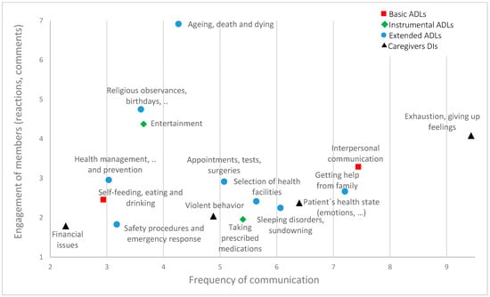 Activities of EADLs accounted for the largest part (40.7%) of the research sample. In relation to publishing frequency, there are four discussion topics with a similar representation: getting help from the family members (15.3%); sleeping disorders, sundowning (14.6%); appointments; test and surgeries (14.2%); and selection of caregivers and health facilities, moving to a facility (13.6%). On the other side, the themes care of pets (2.1%) and social groups and other public events (4.1%) are communicated the least.
