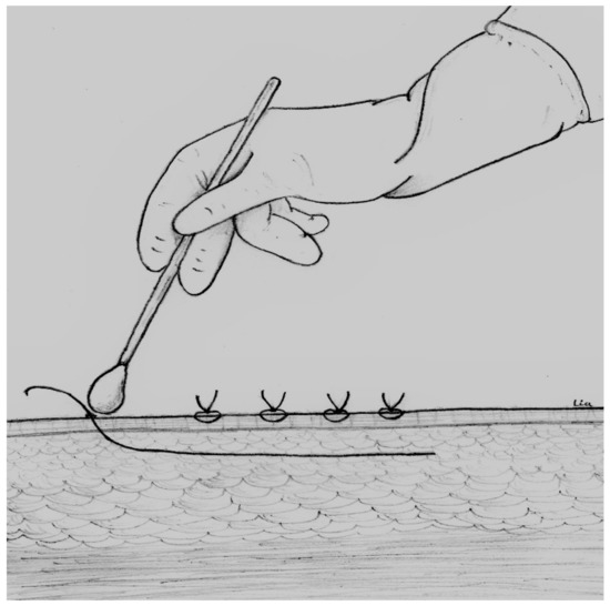 A gauge 2 synthetic absorbable suture thread (Coated, Braided Lactomer 9–1) between 5 and 10 cm long [13,14], normally used in clinical practice, was inserted into the surgical sites of all patients at the end of surgery. After 48 h, the skin was properly disinfected with chlorhexidine 2%, in order to reduce contamination; the internal part of the thread, which remained under the skin, was removed and sent to the laboratory for microbiological analysis. In addition, a wound swab was made at the cutaneous exit point of the suture thread (Figure 1). The swab was sent for a microbiological examination, to evaluate the possible contamination of the extracted thread by the bacteria present on the skin at the cutaneous exit point. A thread was considered colonized when the presence of bacteria, without apparent clinical symptoms or tissue reaction, was observed by microbiological methods.