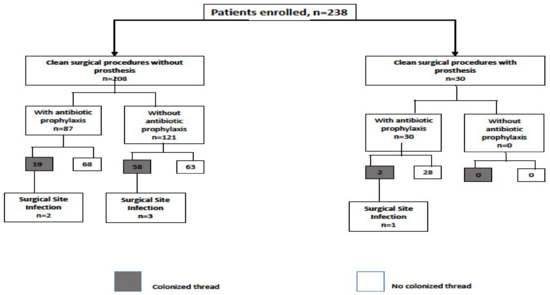 In conclusion, in the clean surgical procedures we found a significant association between the presence of colonized thread and SSI risk. Moreover, the bacteria identified on the thread at 48 h after the procedure were those responsible for SSI later, allowing clinicians to start a specific antimicrobial therapy; thus, it seems to be relevant in the clinical practice. Further clinical investigations are warranted in larger studies to confirm these results, which should also use a control group with sutures that are already covered with antimicrobial film.