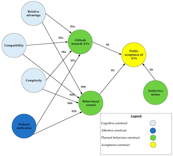 Through the theoretical lens of TPB, the objective of this study is to recognise the factors influencing public acceptance of AVs and examine their interrelationships. This study proposes that the tenets of TPB which include attitude, subjective norms and behavioural control have direct influence on public acceptance of AVs. It further posits that attitude and behavioural control are influenced by cognitive and affective dimensions. The cognitive dimensions include relative advantage, compatibility and complexity which are obtained from the innovation diffusion framework. The affective dimension is reflected by hedonic motivation, which relates to emotions concerning the use of AVs.