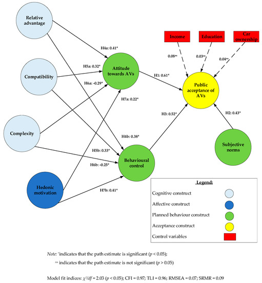 Figure 2 indicates the estimated structural parameters of the proposed model. Further, control variables comprising income, education, and car ownership were incorporated into the model to take responsibility for their influence on public acceptance of AVs. These factors were observed to affect the uptake of AVs considerably [18,49].