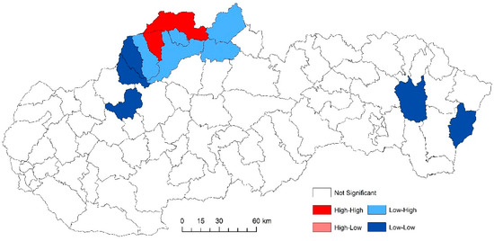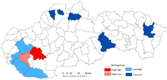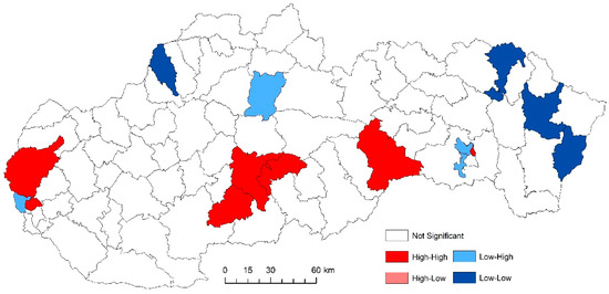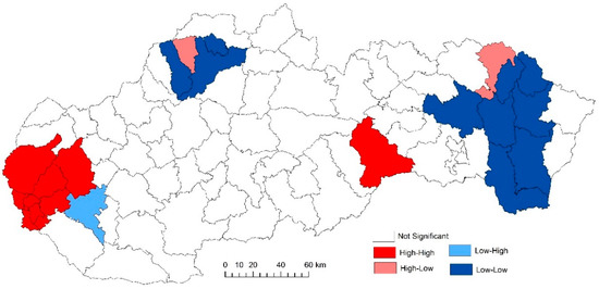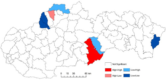 For the analysis of the detection of specific spatial clusters, the local version of the Moran I criterion [22] was used, which evaluates the degree of autocorrelation of a spatial quantity between a given point of the space and its surroundings. The corresponding indicator is suitable for the location of units with relatively high (i.e., above-average) or low (i.e., below-average) values (so-called positive spatial correlation) or sudden turns in spatial distribution of the studied phenomena (negative spatial correlation). The statistical interference of all three applied indicators (General G, Moran’s I criterion, and Local Moran’s I) is based on the calculation of the Z-score.