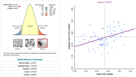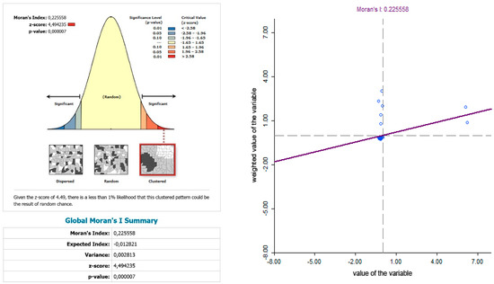 It is important to note that the size of Moran’s index itself does not indicate the statistical significance. Statistical significance of the calculated values, which rejects the null hypothesis of non-existence of spatial autocorrelation, was verified by the permutation method, using the software GeoDa, when all values are considered statistically significant at 1% level of significance.