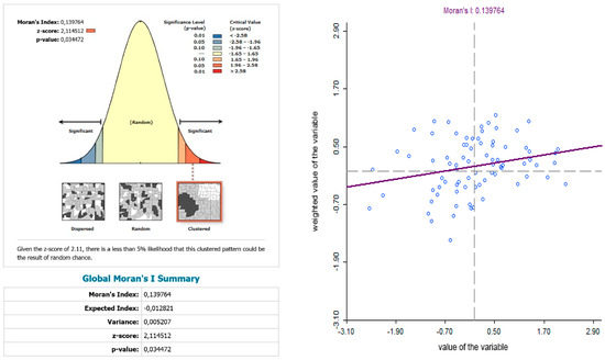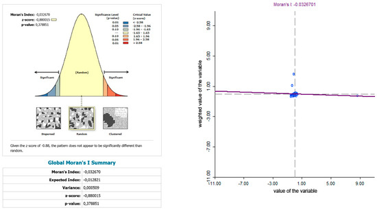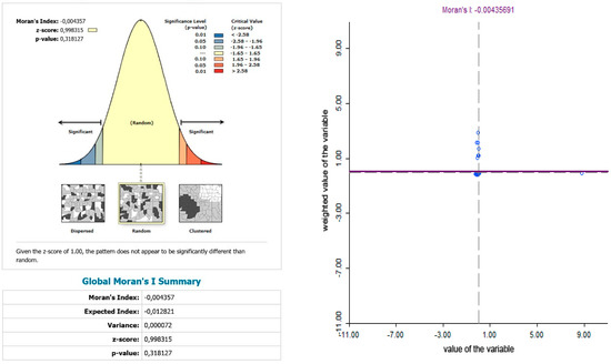 Local Moran’s index, known as the local index of spatial autocorrelation (LISA), was used. LISA analysis allowed the identification of the existence of spatial clusters or regions with high or low values for the analyzed variables. There can be five different scenarios within the LISA: (1) high-high, “hot spots”; (2) low-low, “cold spots”; (3) high-low, “spatial outliers”; (4) low-high, again “spatial outliers”; and (5) no significant local spatial autocorrelation. This methodology allows the identification of regions that contribute to spatial autocorrelation.